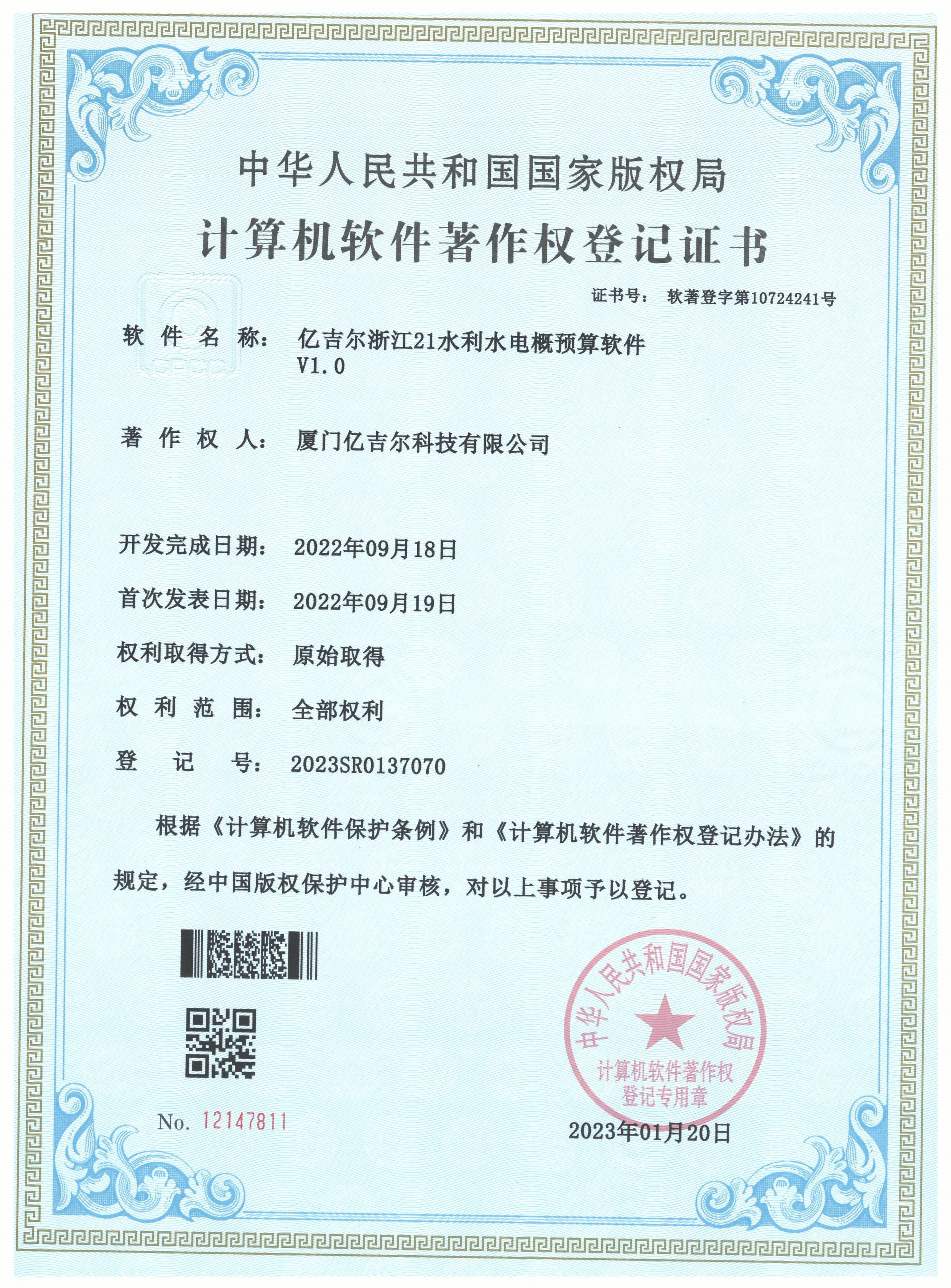 億吉爾浙江21水利水電概算軟件登記證書(2022R11L1869444)